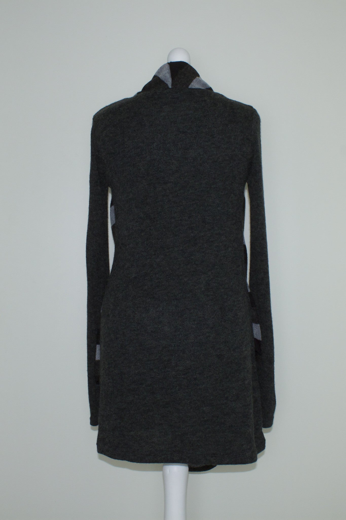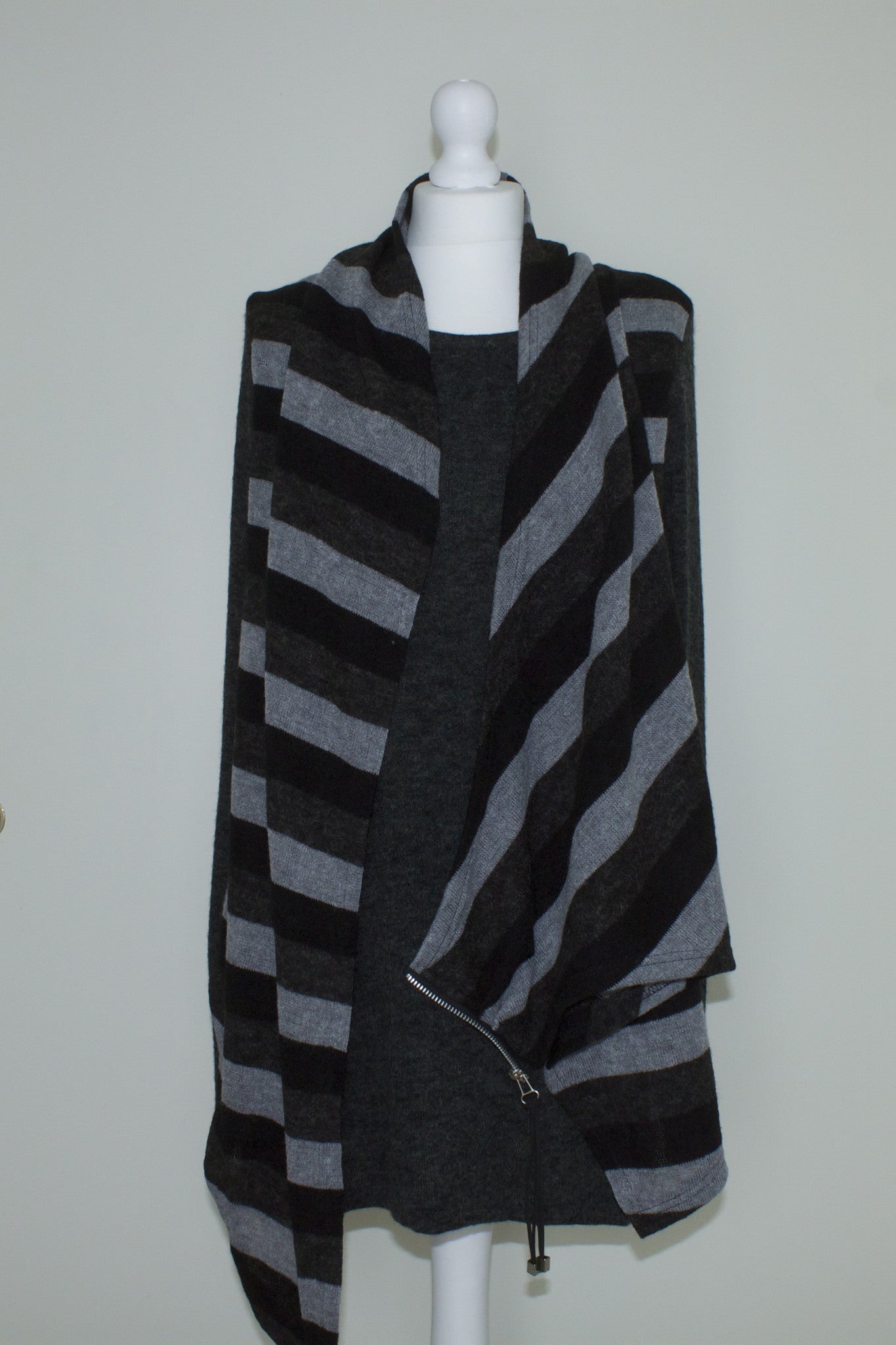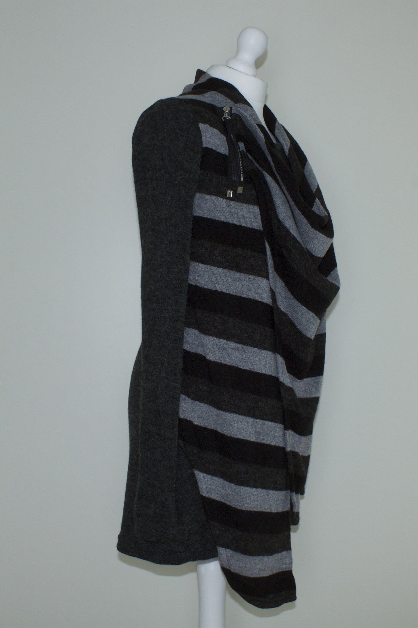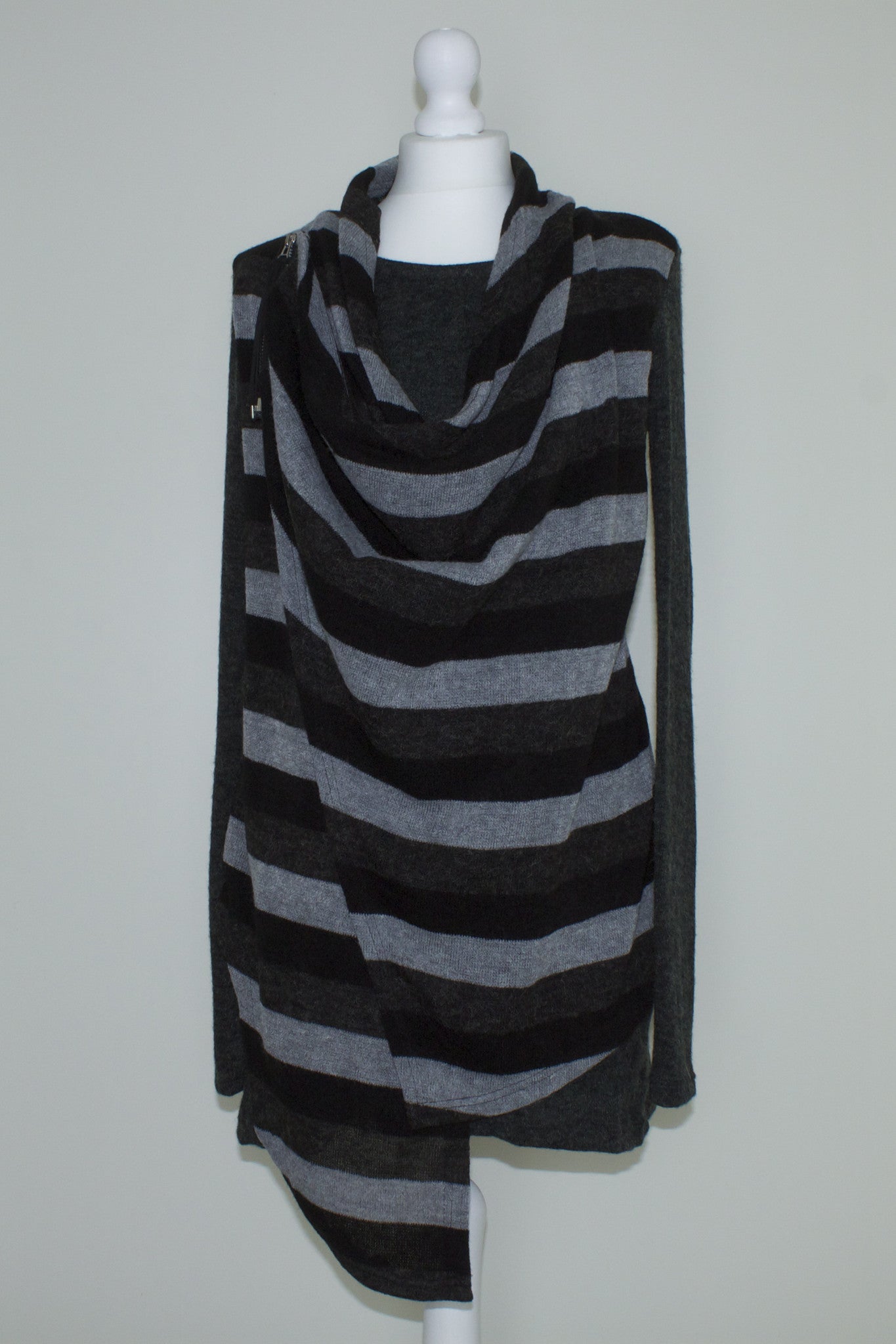 Wool sweatshirt with built in cardigan that can be zipped on the right size of your shoulder for instant scarf.